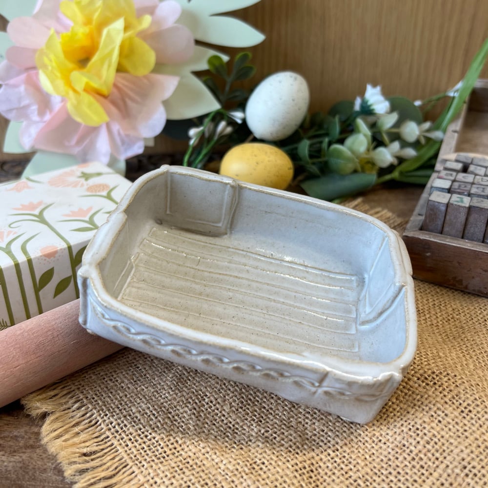 Finished dish will be approx 12cms x 9cms, glazed white and will be dish washer safe.