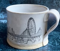 A large hand-built stoneware mug with my hand drawn image applied. Designed for holding cupped in two hands, whilst celebrating the magnificence of one of our local views. Cherished by our family for walking, theatre, promenading, live music & street entertainers and a memorable part of the route for all those that joined The Queue for the Queen's laying in state in 2022.