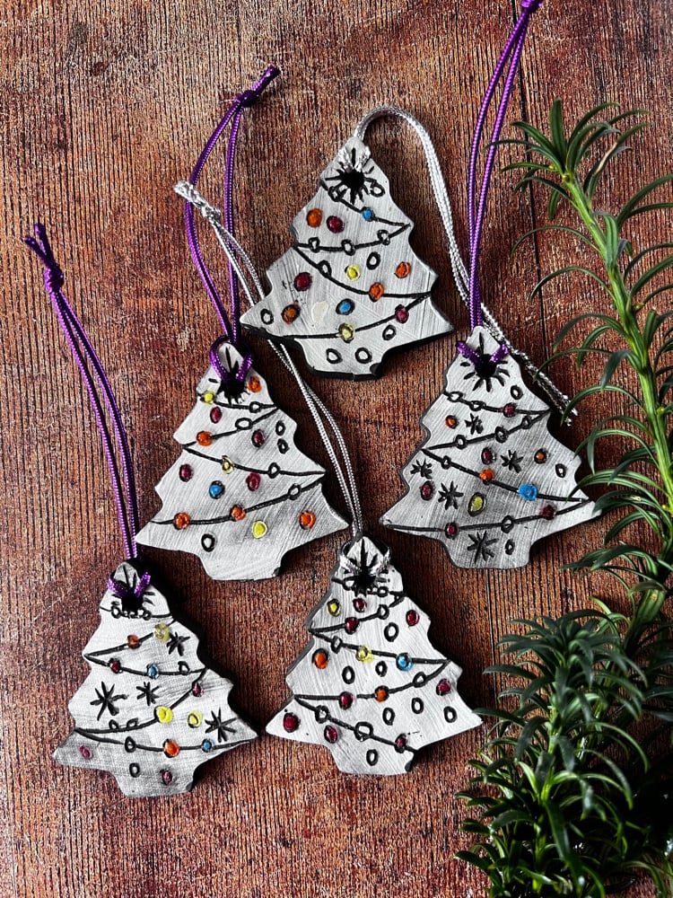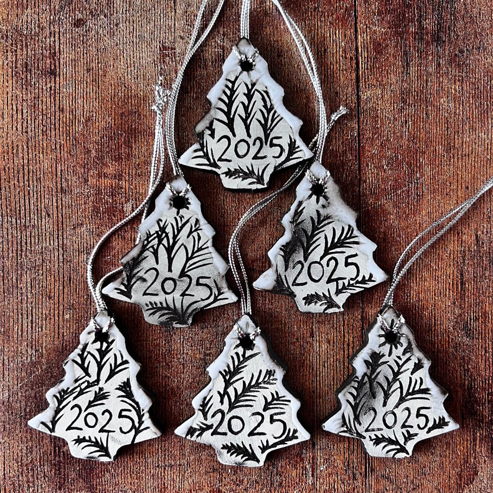hand drawn Xmas tree decoration on black clay with traditional sgrafitto technique.